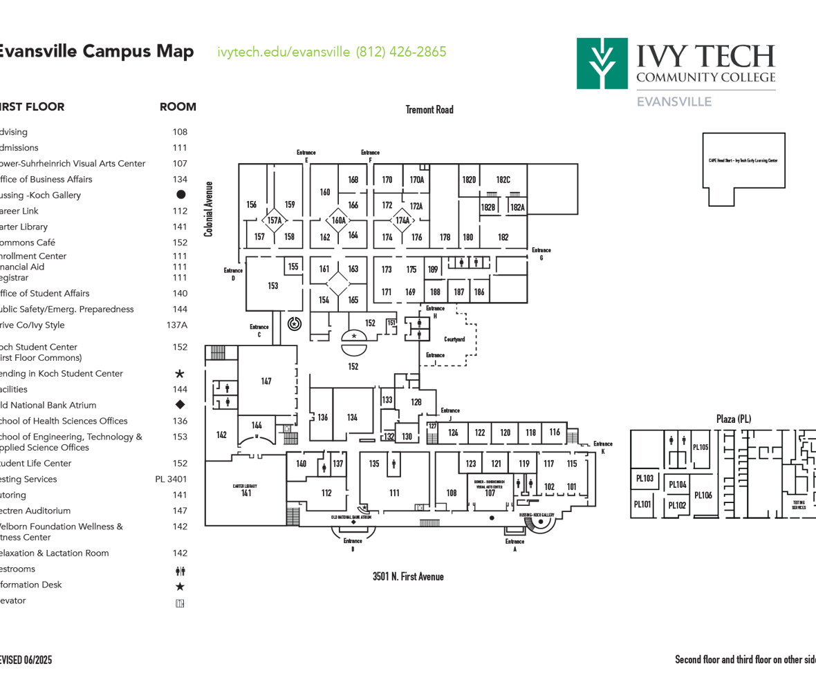 Evansville Campus Map The Ivy Tech Evansville campus currently consists of three buildings at the main campus on First Avenue in Evansville.