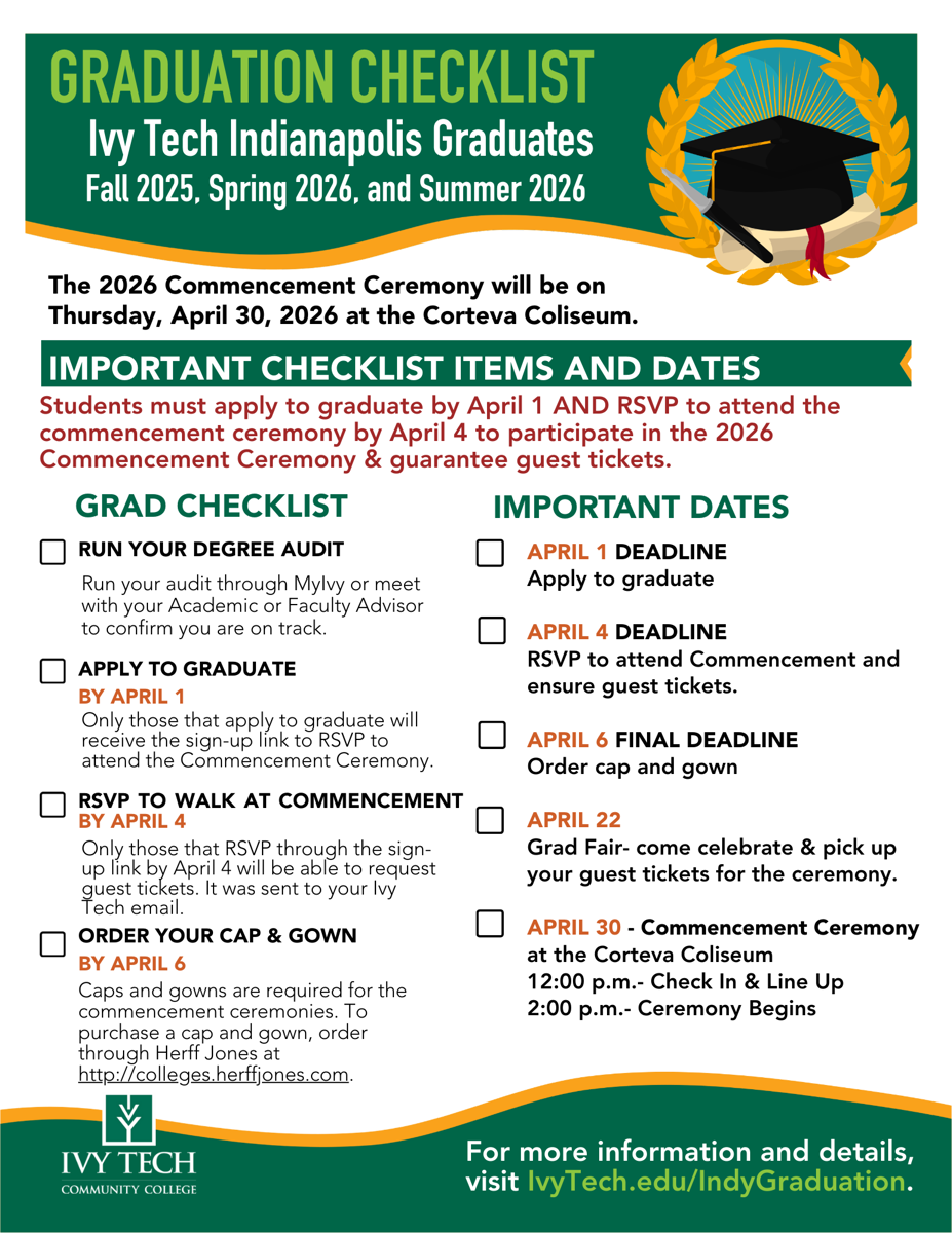 You must run your degree audit and speak with your advisor to ensure you are on track to graduate. For assistance running your audit, attend a virtual Zoom room open session or email indy-graduation@ivytech.edu.