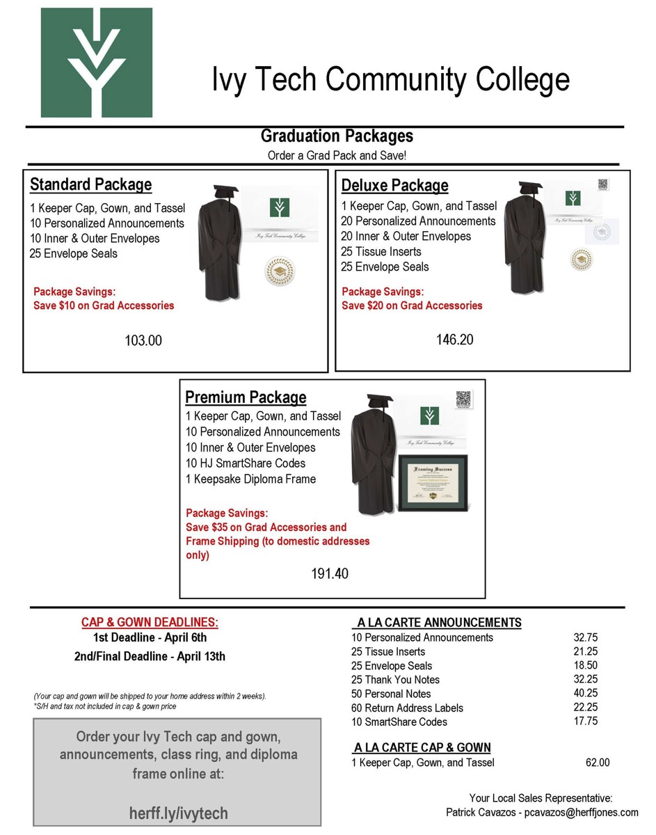 Cas and gowns are available at this link: herff.ly/ivytech. The cost of the cap and gown is $58.70